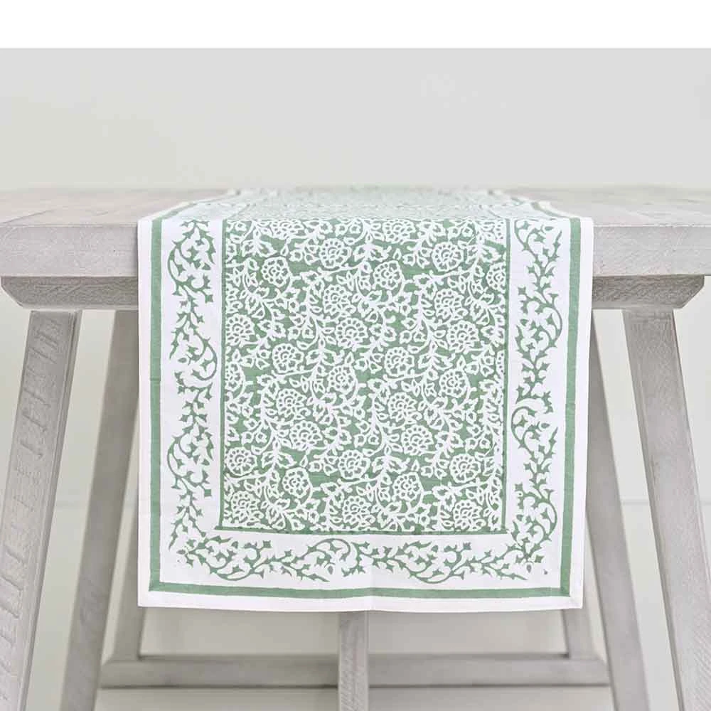 This updated traditional classic green and white hand block printed Tapestry Green Table Runner was designed to symbolize the weaving of stories that are shared during meals. Explore conversations with family, friends, and guests that remind us of the beauty of details and encapsulates the tapestry of your entertaining.
