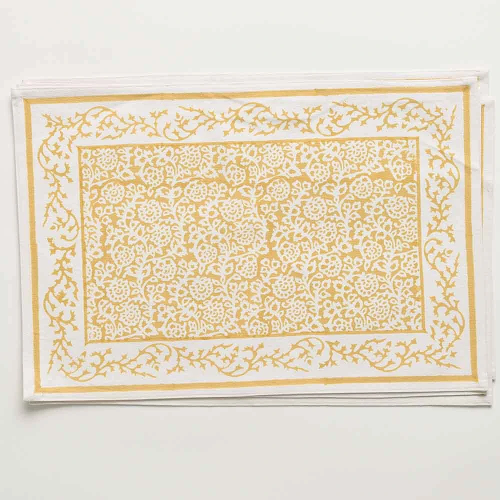 This updated traditional classic yellow and white hand block printed Tapestry Marigold placemat was designed to symbolize the weaving of stories that are shared during meals. Explore conversations with family, friends, and guests that remind us of the beauty of details and encapsulates the tapestry of your entertaining.