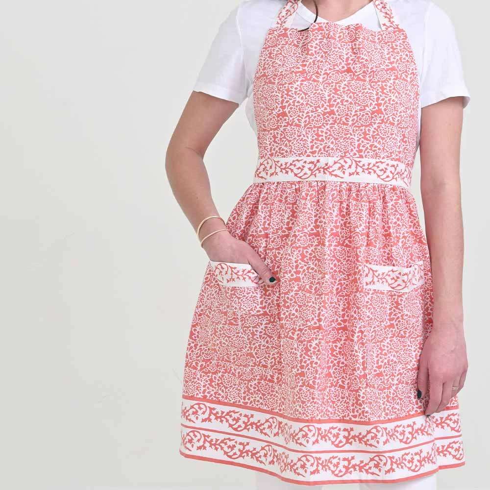 This updated traditional classic red and white hand block printed Tapestry Persimmon Apron was designed to symbolize the weaving of stories that are shared during meals. Explore ingredients in an apron that reminds us of the beauty of details and encapsulates the tapestry of your entertaining.