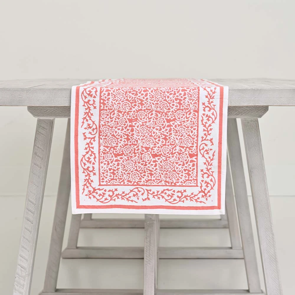 This updated traditional classic red and white hand block printed Tapestry Persimmon Tablecloth was designed to symbolize the weaving of stories that are shared during meals. Explore conversations with family, friends, and guests that remind us of the beauty of details and encapsulates the tapestry of your entertaining.