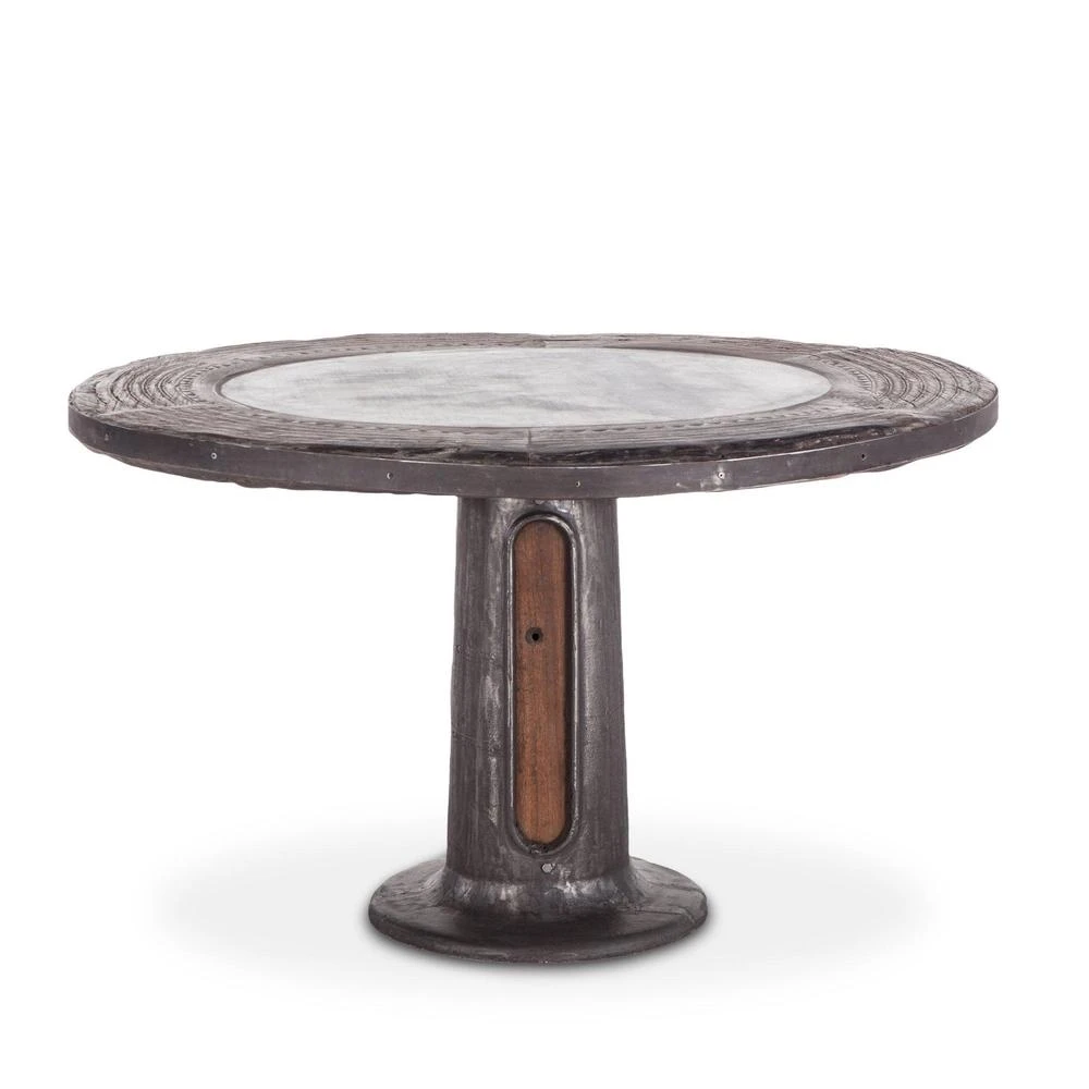 The antique-styled, hand-forged cast iron pedestal base in natural patina finish is designed to enhance the industrial look of the table. This round table requires assembly