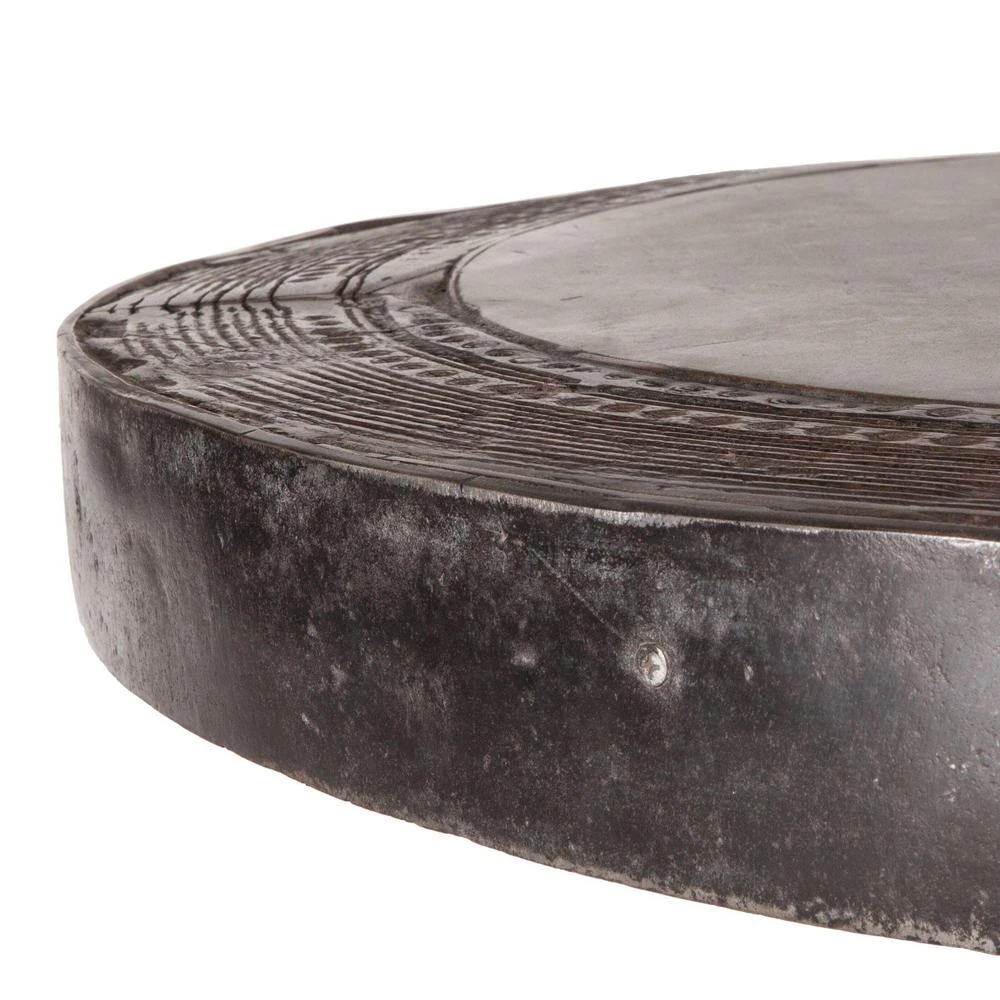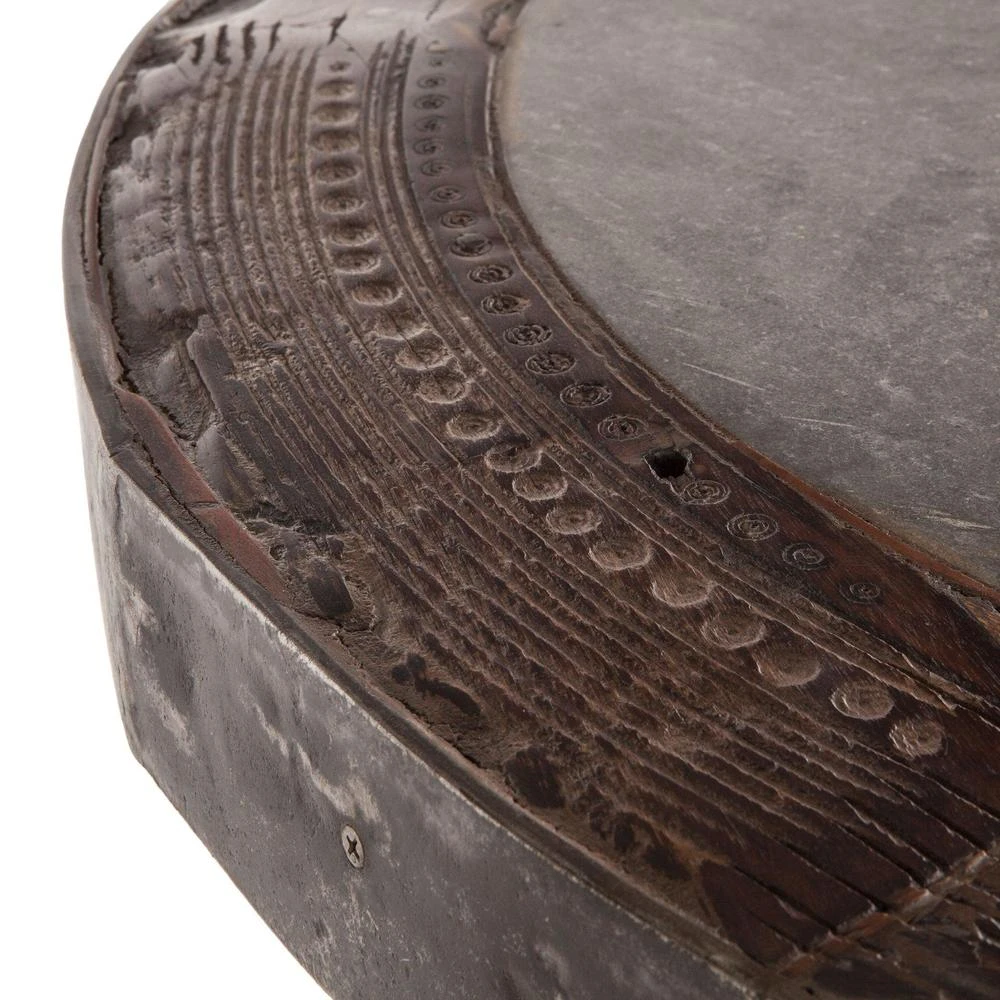 - 3″ thick reclaimed teak wood wagon wheels framed in a welded iron rim and inlaid with a natural white marble center.